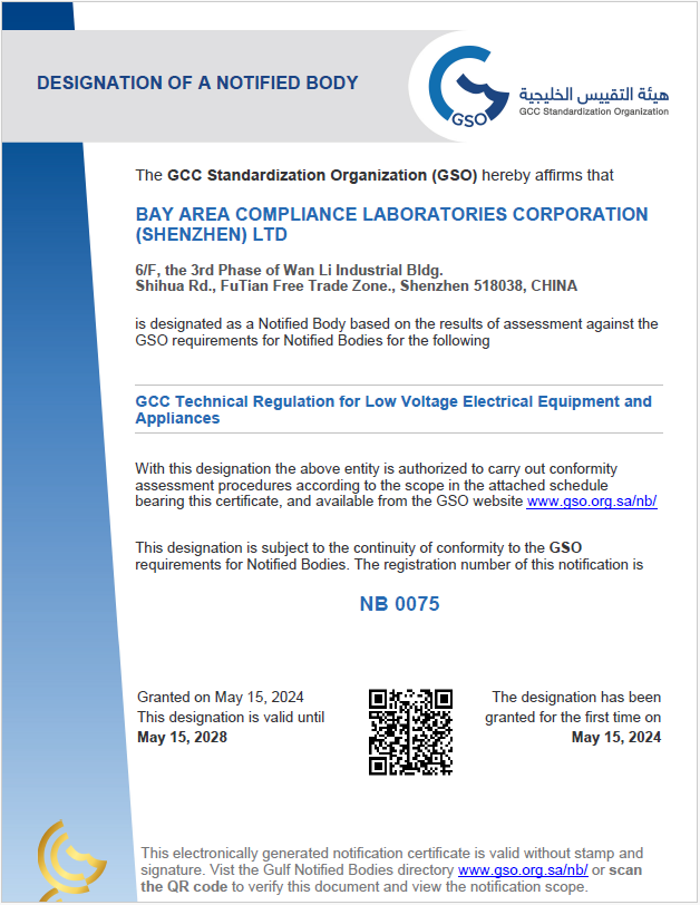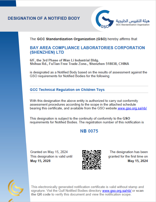 2024年5月,BACL成功被海灣標準化組織(GSO)認定為低壓電氣設備(LVE)和兒童玩具兩個(gè)領(lǐng)域的NB公告機構。