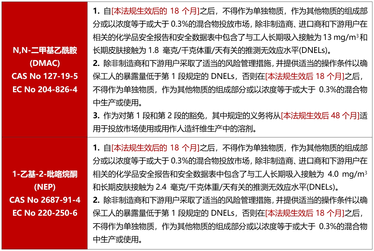2024年7月30日,歐盟委員會(huì )向世界貿易組織(WTO)提交G/TBT/N/EU/1079通知,擬更新REACH法規((EC) No 1907/2006)附錄XVII,增加N,N-二甲基乙酰胺(DMAC)和1-乙基-2-吡咯烷酮(NEP)的限制條款。該提案預計將于2025年第一季度通過(guò)。