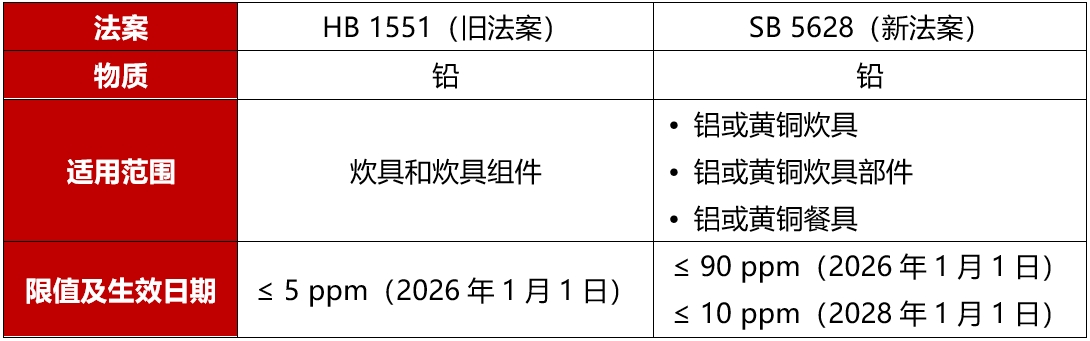 [導讀]: 2024年3月28日,華盛頓批準了HB 1551,修訂華盛頓法典,新增RCW 70A章節有關(guān)炊具含鉛法案。 2025年5月13日,華盛頓州州長(cháng)簽署SB 5628修訂華盛頓炊具含鉛法案,修改了法案的適用范圍,并放寬了鉛的限值。 新舊法案要求比對: ...