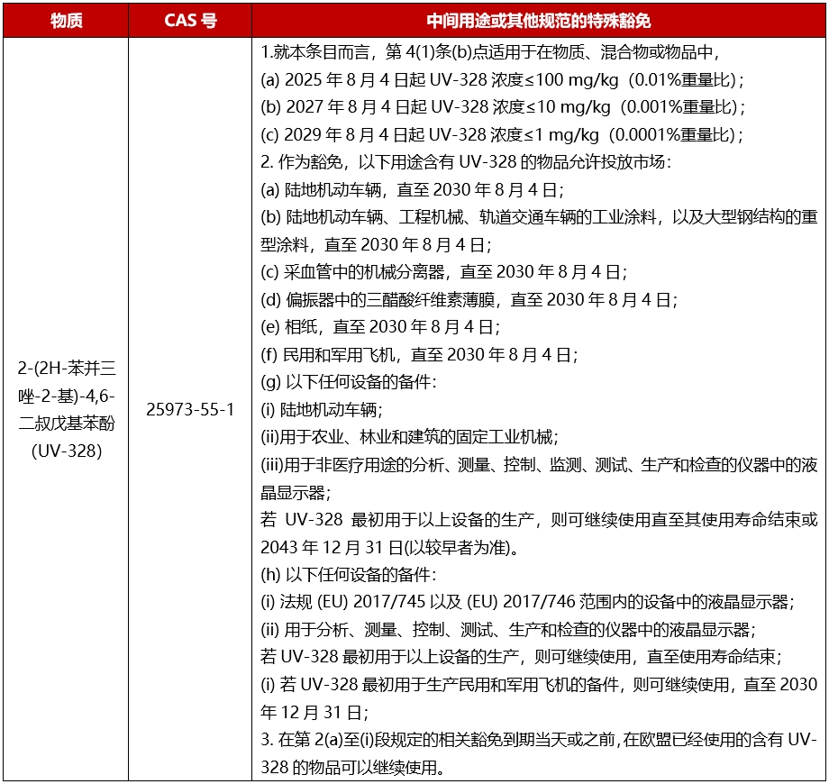 2025年7月15日,歐盟官方公報發(fā)布法規(EU) 2025/843,修訂歐盟持久性有機污染物(POPs)法規(EU) 2019/1021,在POPs法規附錄I的A部分新增2-(2H-苯并三唑-2-基)-4,6-二叔戊基苯酚(UV-328)的限制要求。該法規于歐盟官方公報上公布后第20日起生效。