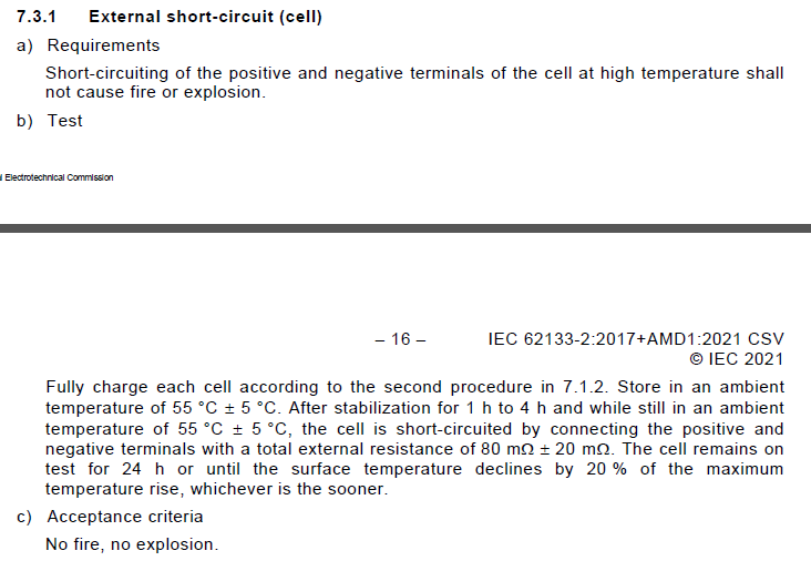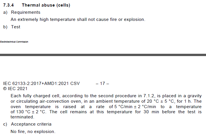 標準IEC 62133-2 Clause 7.3.1&7.3.4要求原文: