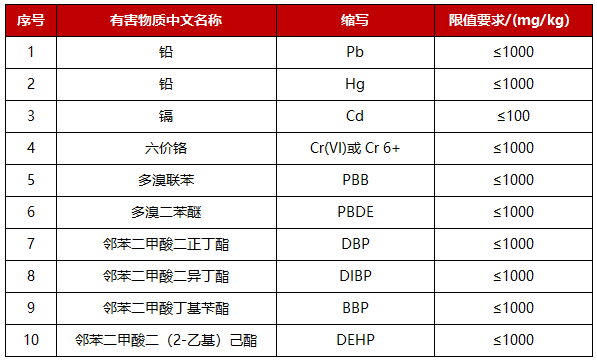 (1)將我國電器電子產(chǎn)品管控有害物質(zhì)種類(lèi)由六大類(lèi)增至十大類(lèi),保持與國際行業(yè)要求一致(新增4種鄰苯二甲酸酯類(lèi)有害物質(zhì)(PAEs):鄰苯二甲酸二正丁酯(DBP)、鄰苯二甲酸二異丁酯(DIBP)、鄰苯二甲酸丁基芐酯(BBP) 和鄰苯二甲酸二(2-乙基)己酯(DHP)的管控限值),詳情如下: