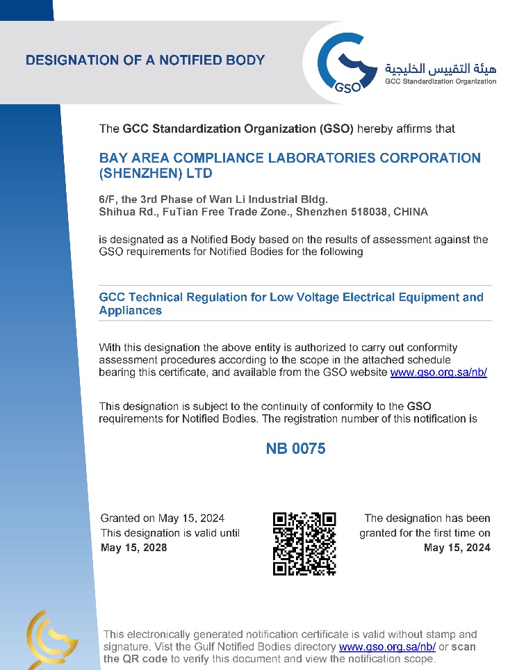 同時(shí),BACL也是GSO認可的NB公告機構和SASO官方認定的發(fā)證機構,可為廣大客戶(hù)提供LVE產(chǎn)品的SASO發(fā)證服務(wù)及頒發(fā)G-Mark認證;我們在中東地區審核發(fā)證方面擁有豐富的經(jīng)驗,能幫助您順利獲得證書(shū)出口貨物到中東,高效拓展中東市場(chǎng)。