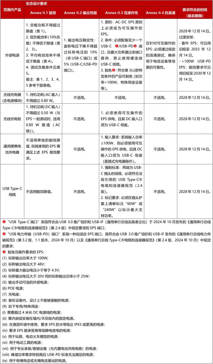 生態(tài)設計要求:EPS、無(wú)線(xiàn)充電器、無(wú)線(xiàn)充電板、通用便攜式電池充電器和 USB Type-C 數據線(xiàn)應符合本法規附件二和附件三規定的生態(tài)設計要求。