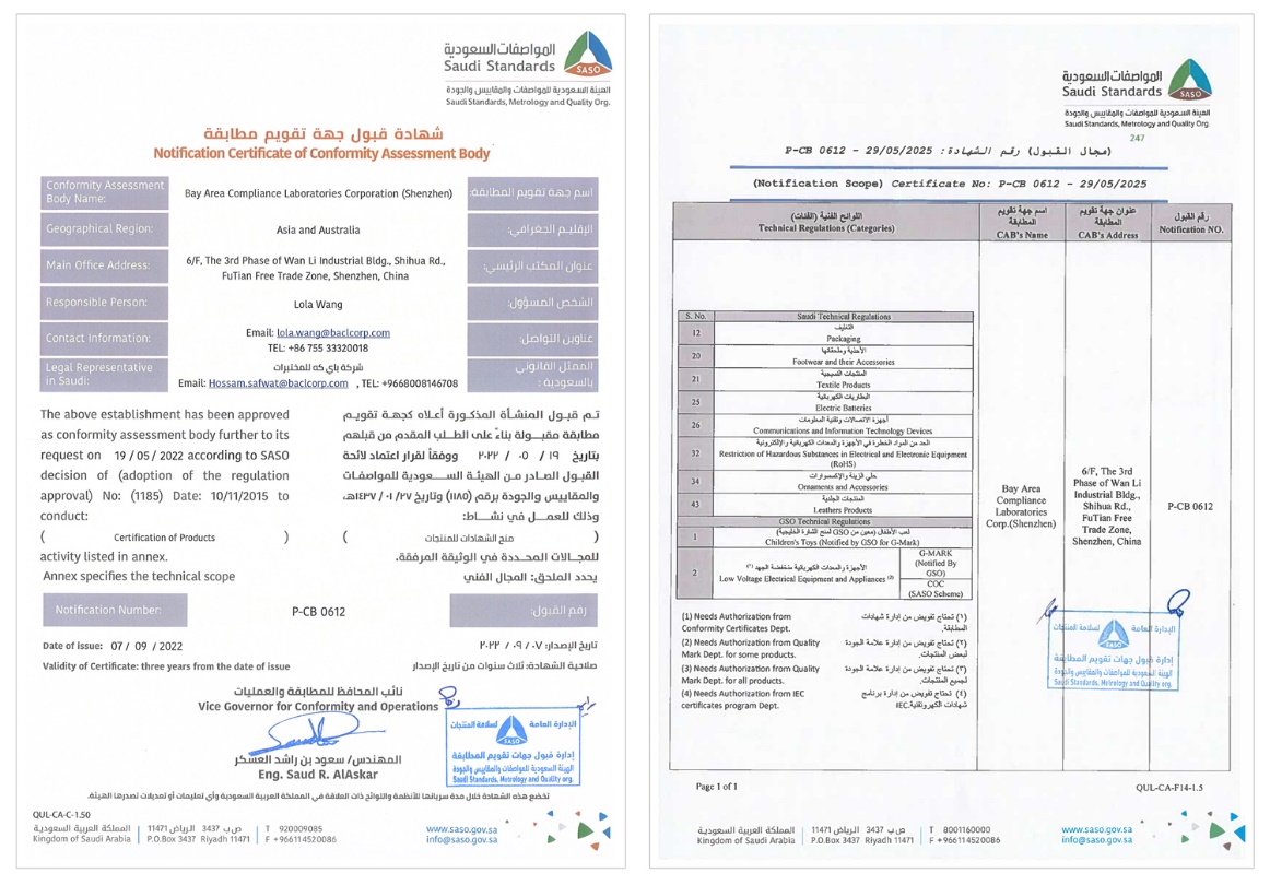 同時(shí),BACL也是GSO認可的NB公告機構和SASO官方認定的發(fā)證機構,可為廣大客戶(hù)提供LVE產(chǎn)品的SASO發(fā)證服務(wù)及頒發(fā)G-Mark認證;我們在中東地區審核發(fā)證方面擁有豐富的經(jīng)驗,能幫助您順利獲得證書(shū)出口貨物到中東,高效拓展中東市場(chǎng)。